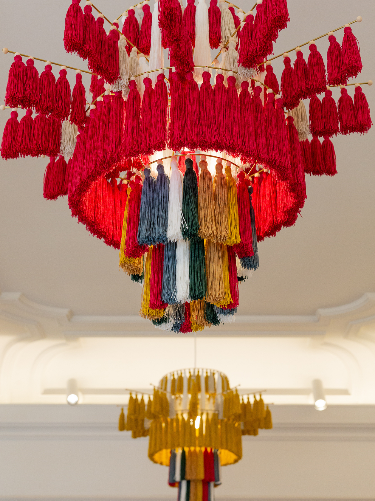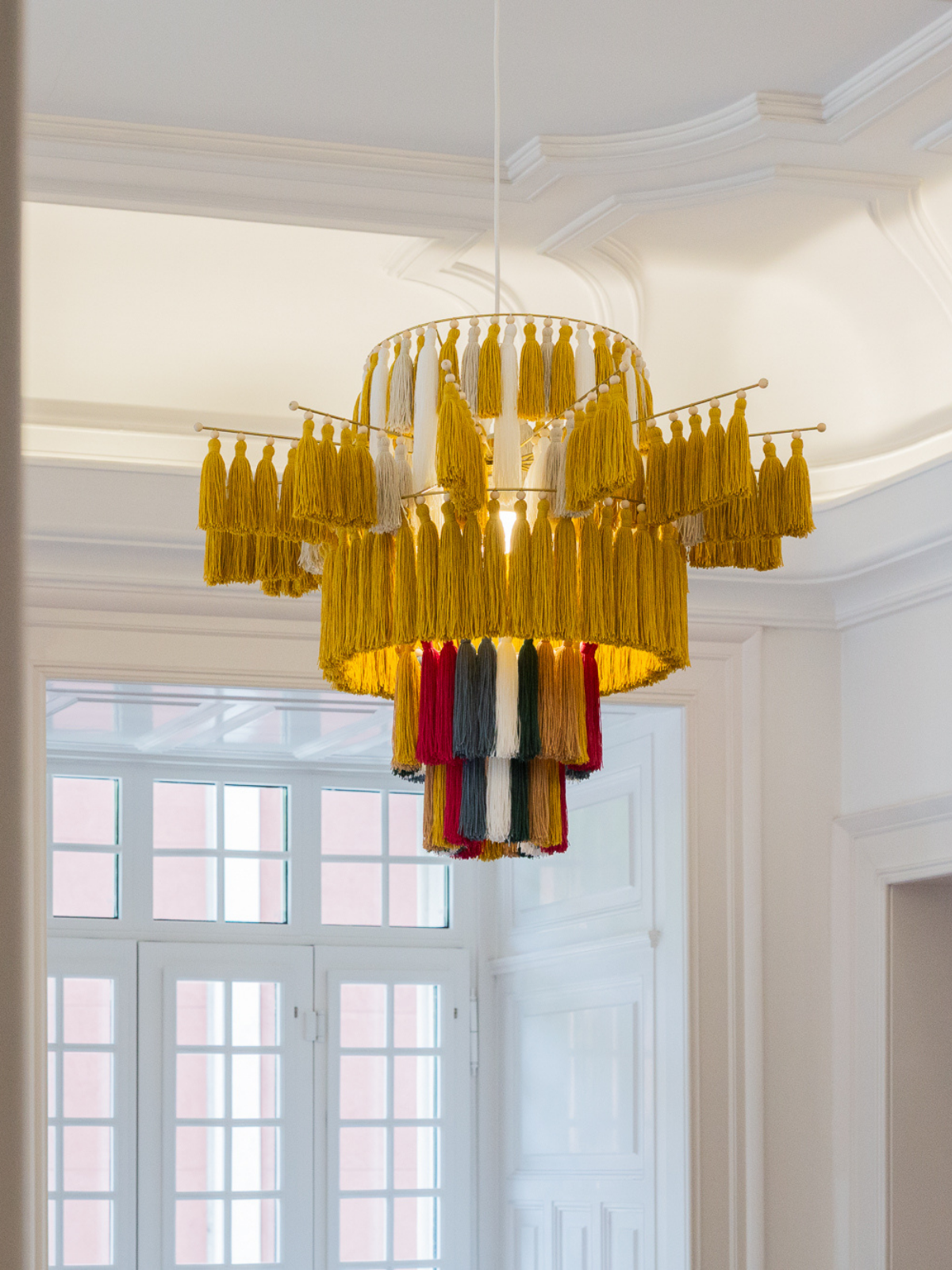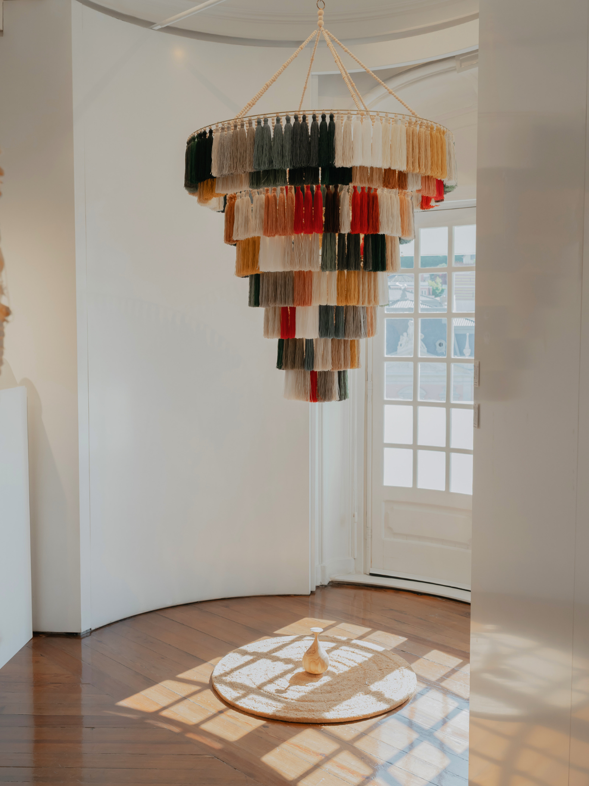 Floating in space, these luminous structures capture light and movement with delicacy and intention. Tassels become botanical elements. Fibre becomes atmosphere. Light becomes presence. What emerges is not decoration, but an experience — where material, space and perception converge.